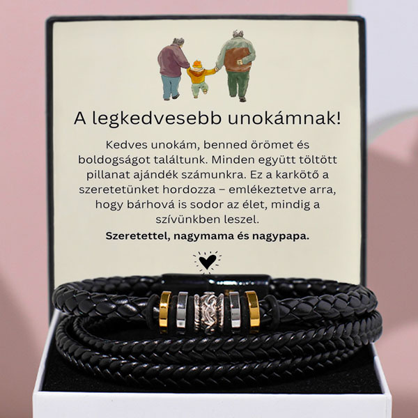 Kedves unokám, benned örömet és boldogságot találtunk. Minden együtt töltött pillanat ajándék számunkra. Ez a karkötő a szeretetünket hordozza – emlékeztetve arra, hogy bárhová is sodor az élet, mindig a szívünkben leszel.