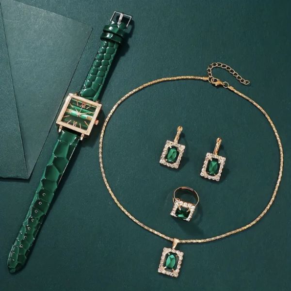 Ez az elegáns együttes szögletes kvarcból álló, szembetűnő zöld színárnyalatú vintage kvarcórát tartalmaz, amelyeket egy káprázatos strasszköves ékszerkészlet egészít ki, lehetővé téve, hogy egyszerre emelje saját stílusát és ossza meg az eleganciát szeretteivel. 🎁⌚💚
