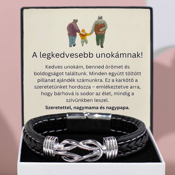 Kedves unokám, benned örömet és boldogságot találtunk. Minden együtt töltött pillanat ajándék számunkra. Ez a karkötő a szeretetünket hordozza – emlékeztetve arra, hogy bárhová is sodor az élet, mindig a szívünkben leszel.
