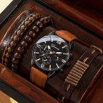 Egy órából és három karkötőből álló készlet, amelyet az egyszerűséget és eleganciát értékelő modern férfi számára terveztek.